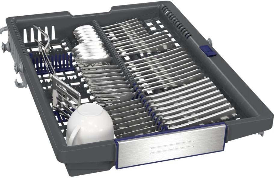 Корзина для столовых приборов достаточно высока, ввиду чего она устанавливается в нижнем коробе, где для нее предусматривается специальное место между разделителями для тарелок. Приборы в корзине могут размещаться как вниз, так и вверх рукоятками — это зависит от количества приборов и требований пользователя. Однако острые предметы — ножи или вилки — необходимо размещать острием вниз для предотвращения травм. Ножи рекомендуется размещать в корзинах с осторожностью, поскольку лезвия из керамики, например, могут затупиться. Чтобы избежать этого, следует использовать фирменные моющие средства и обязательно располагать ножи по отдельности, чтобы они не соприкасались с другими предметами.