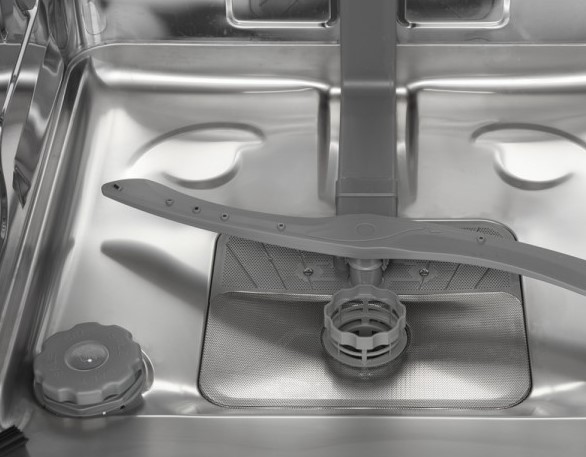 Сливной фильтр располагается на дне камеры и предотвращает попадание в канализацию остатков пищи и засорение сливного шланга и насоса. Материал изготовления и конструкция фильтра зависит от модели посудомойки. В устройствах премиум-класса сливной фильтр изготавливается из стали и имеет вид цилиндра из частой сетки, задерживающей даже мелкий мусор. В более дешевых моделях эта деталь может изготавливаться из пластика. Рекомендуется извлекать и промывать этот фильтр не реже раза в месяц при постоянном использовании посудомойки, а посуду перед помещением в корзину очищать от крупных остатков пищи.