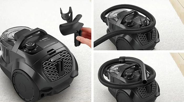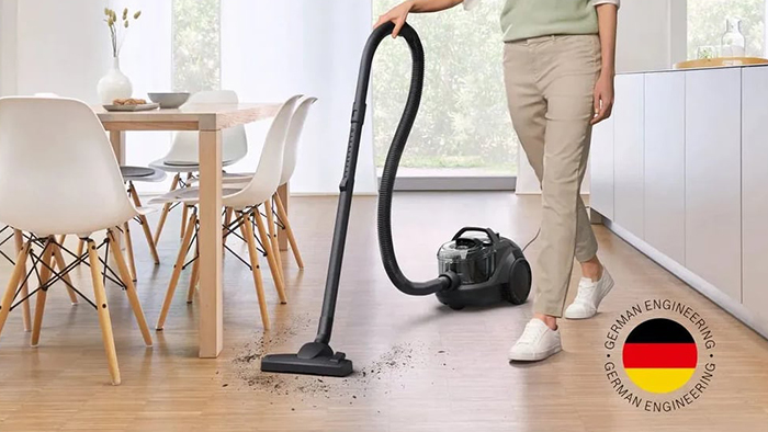 Пылесос Bosch BGC21X300 имеет стандартную конфигурацию — корпус на колесах, крепящийся к нему шланг с трубками-удлинителями и насадками. Данная модель рассчитана только на сухую уборку, которой достаточно для большинства пользователей. Мощный поток воздуха позволяет быстро всасывать как мелкие, так и крупные частицы, волосы и шерсть. Основной цвет прибора — черный. В качестве пылесборника производитель установил стандартный контейнер. Пользоваться им легко и удобно: чтобы очистить, просто достаньте его и высыпьте все в мусорное ведро, а затем протрите или вымойте емкость изнутри. Объем заполнения пылесборника — 2 л.
