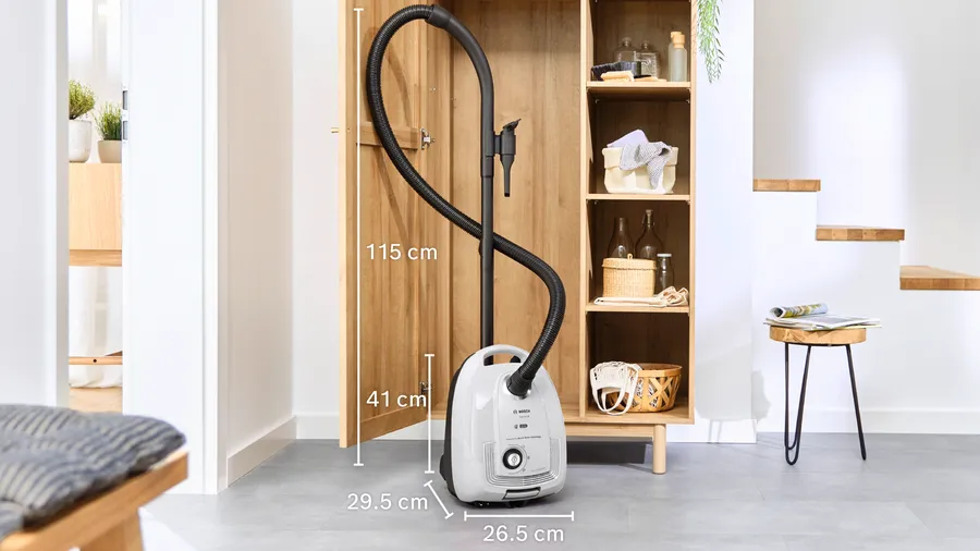 Пылесос Bosch BGL38WH2 имеет стандартную конфигурацию — корпус на колесах, крепящийся к нему шланг с трубками-удлинителями и насадками. Данная модель рассчитана только на сухую уборку, которой достаточно для большинства пользователей. Мощный поток воздуха позволяет быстро всасывать как мелкие, так и крупные частицы, волосы и шерсть. Основной цвет прибора — белый. Пылесборник-мешок — привычный вариант, с которым легко работать, можно не беспокоиться о чрезмерном расходе электроэнергии. Он тщательно запирает внутри крупную пыль, но может незначительно пропускает очень мелкие частицы. Объем заполнения пылесборника — 4 л.