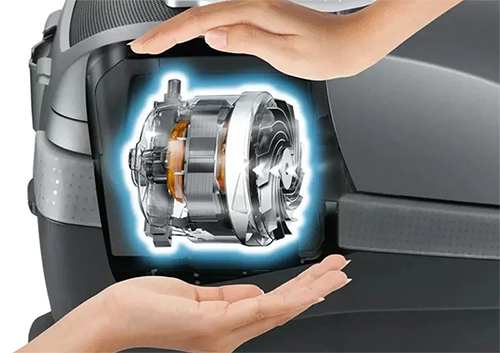 Управление мощностью на корпусе пылесоса производится при помощи поворотного переключателя или кнопок с обозначениями «+» и «-». Расположение управляющих элементов на корпусе — особенность напольных пылесосов: кнопки на них достаточно велики, чтобы нажимать их можно было не только рукой, но и ногой.