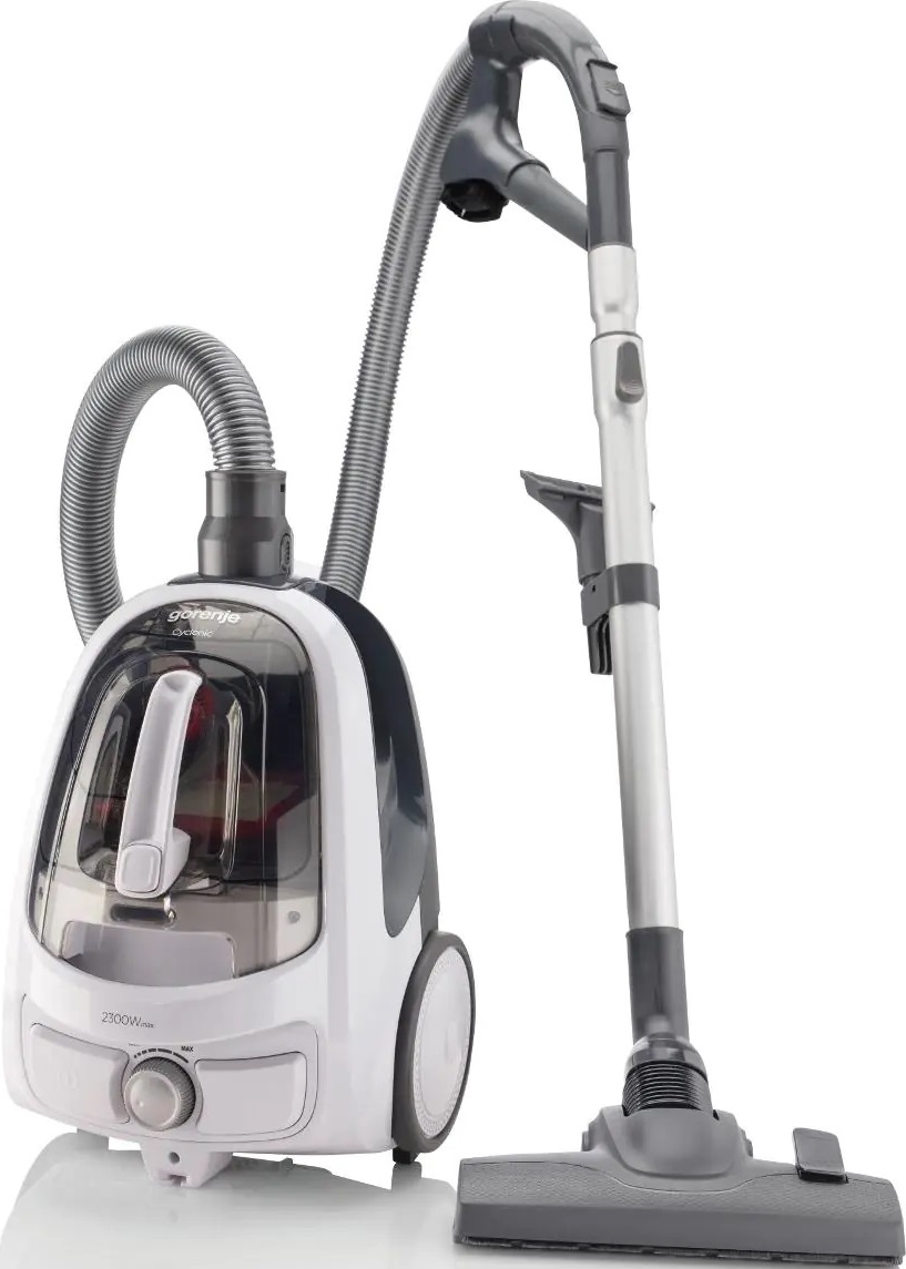 Пылесос Gorenje VC2301SPWCY имеет стандартную конфигурацию — корпус на колесах, крепящийся к нему шланг с трубками-удлинителями и насадками. Данная модель рассчитана только на сухую уборку, которой достаточно для большинства пользователей. Мощный поток воздуха позволяет быстро всасывать как мелкие, так и крупные частицы, волосы и шерсть. Основной цвет прибора — белый. В качестве пылесборника производитель установил стандартный контейнер. Пользоваться им легко и удобно: чтобы очистить, просто достаньте его и высыпьте все в мусорное ведро, а затем протрите или вымойте емкость изнутри. Объем заполнения пылесборника — 1.7 л.