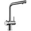 Рычаг для включения фильтрованной воды применяется в современных комбинированных смесителях, где из одного и того же излива подается и водопроводная, и питьевая вода. Такие смесители типа «два в одном» отличаются от обычных тем, что имеют не два подключения, а три, где третье соединяет смеситель с фильтром. Очищенная вода подается по изолированной трубке, проходящей внутри излива. Для удаления накипи, солей металлов, микроорганизмов и прочих вредных примесей могут применяться различные типы фильтров. Проточные фильтры устанавливаются под мойкой и включают несколько картриджей, которые необходимо менять по мере использования. С их помощью можно избавиться от таких примесей, как железо, хлор и многие другие. Устройства с системой обратного осмоса оснащаются диффузором, включающим картриджи для предварительной очистки и осмотическую мембрану, задерживающую практически все вредные примеси.
