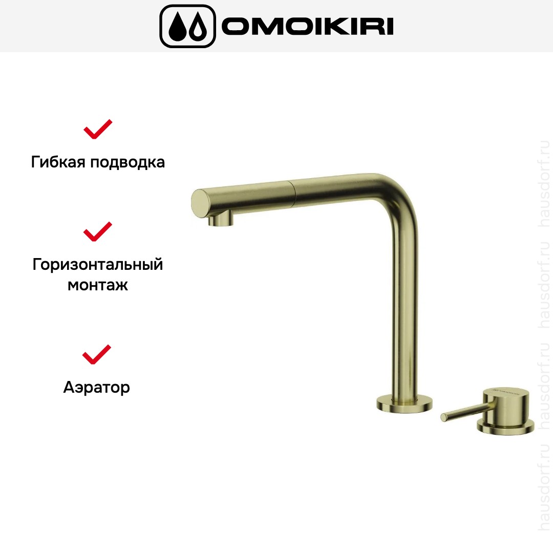 Смеситель OMOIKIRI Nara-S LG выполнен в светлом золотом тоне и сочетает в себе элегантную внешность с продуманной эргономикой. Его аккуратные пропорции и глянцевая поверхность привлекают внимание, но не доминируют в интерьере, что делает изделие универсальным для разных стилей кухни.