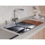 Специальная насадка позволяет выдвинуть излив как маленький шланг и направить струю в слишком высокую кастрюлю, которая не помещается под стационарным краном, на овощи в раковине, на загрязнения в неудобных уголках мойки, которые нужно удалить и т.д. Благодаря особой конструкции вы можете также направить воду из раковины в ванну или из одной чаши мойки в другую одним поворотом крана в нужную сторону. Дополнительная деталь, которая повышает комфорт использования, — аэратор. Он делает поток воды мягче, насыщая его кислородом, таким образом дополнительно уменьшая ее расход: объем струи увеличивается за счет воздуха, а не за счет повышения напора из водопровода. К этой модели можно подключить фильтр для питьевой воды.