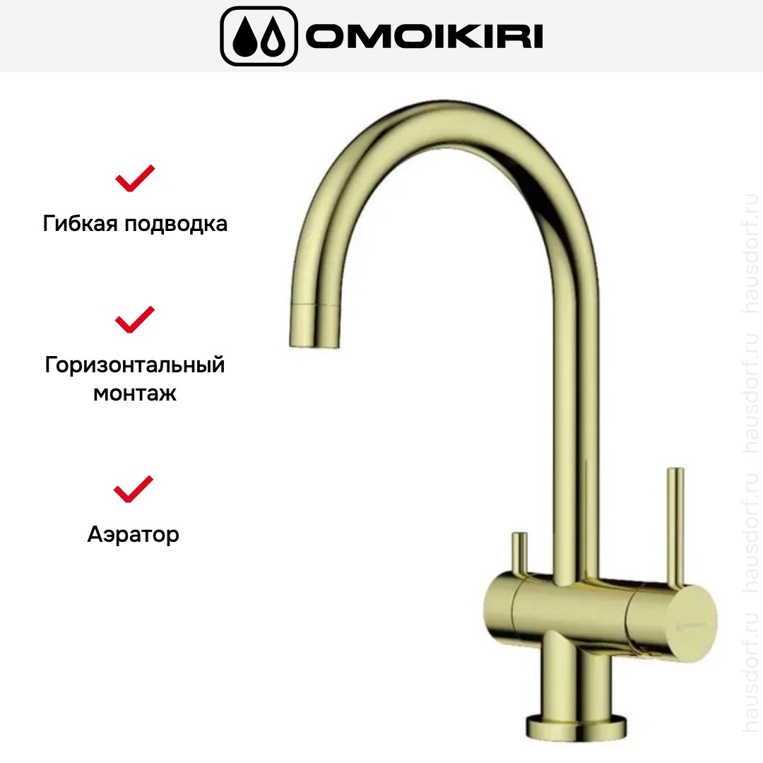 Смеситель OMOIKIRI Yamada LG выполнен в светлом золотом оттенке и сразу притягивает взгляд благодаря сдержанному, но благородному облику. Его габариты 22.1×14.5×37.2 см и аккуратные пропорции делают изделие гармоничным в любом кухонном интерьере. Высота излива 23.4 см и длина носика 20.4 см обеспечивают удобный зазор для мытья больших кастрюль и работы с высокими емкостями. Отделка привносит теплую ноту в цветовую гамму кухни и легко сочетается с деревянными или светлыми фасадами.