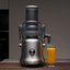 Центробежная соковыжималка с подачей сока в стакан. Благодаря стальным ножам со специальным покрытием быстро и тщательно обрабатываются разные овощи и фрукты, в том числе целиком.