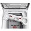 Модели с вертикальной загрузкой отличает надежное крепление барабана на двух валах. Еще одно их отличие — особая конструкция люка: на нем имеется отверстие, закрывающееся на замок. Чтобы получить доступ к барабану, необходимо открыт его и отодвинуть створку.