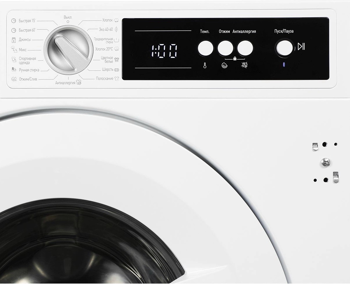 В отличие от другой встраиваемой техники, круглая дверца стиральных машин редко крепится к мебельному фасаду, она способна открываться отдельно. При размещении требуется оставлять зазор между задней стенкой машины и стеной помещения для свободного размещения шлангов. Нижняя часть стиралки закрывается цоколем, а верхняя — столешницей: крышку машины при этом иногда можно снять.