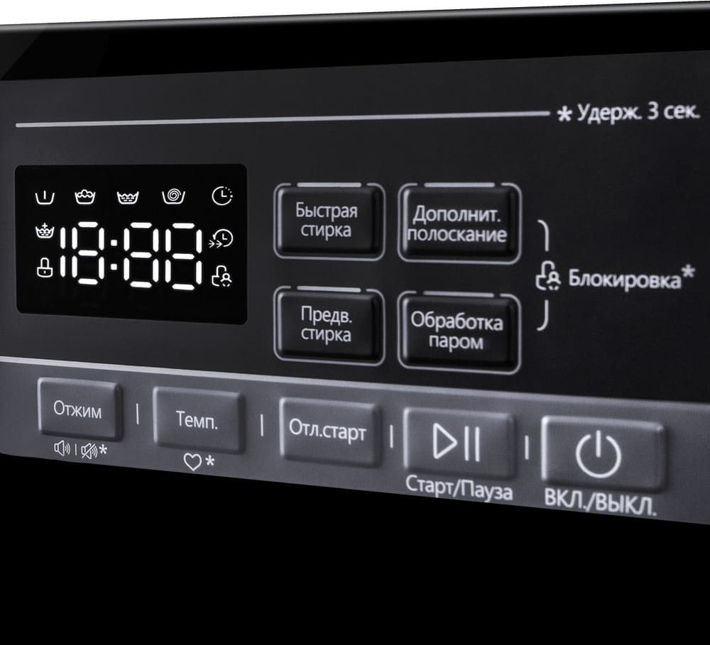 Блокировка панели управления позволяет предотвратить нажатие таких кнопок, как пуск и пауза, регулировка температуры и скорости отжима, кнопок дополнительных функций, а также не допустить поворота переключателя. В некоторых машинах невозможно заблокировать кнопку включения и выключения, однако снять блокировку с ее помощью невозможно.