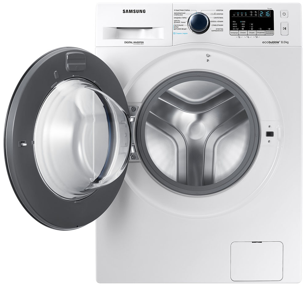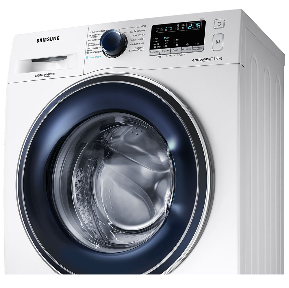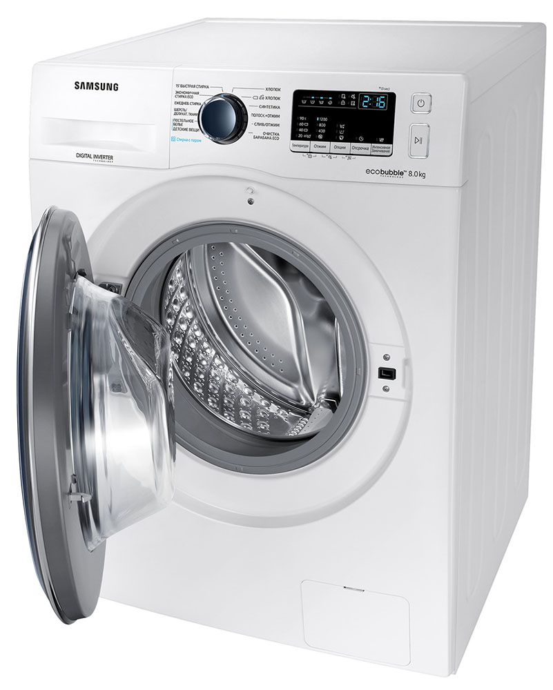 Цвет этой стиральной машинки — белый. В данной модели Samsung используется барабан Swirl. Мотор: Инверторный. Благодаря ему машина работает тише, потребляет меньше электроэнергии, сохраняя при этом необходимую мощность.