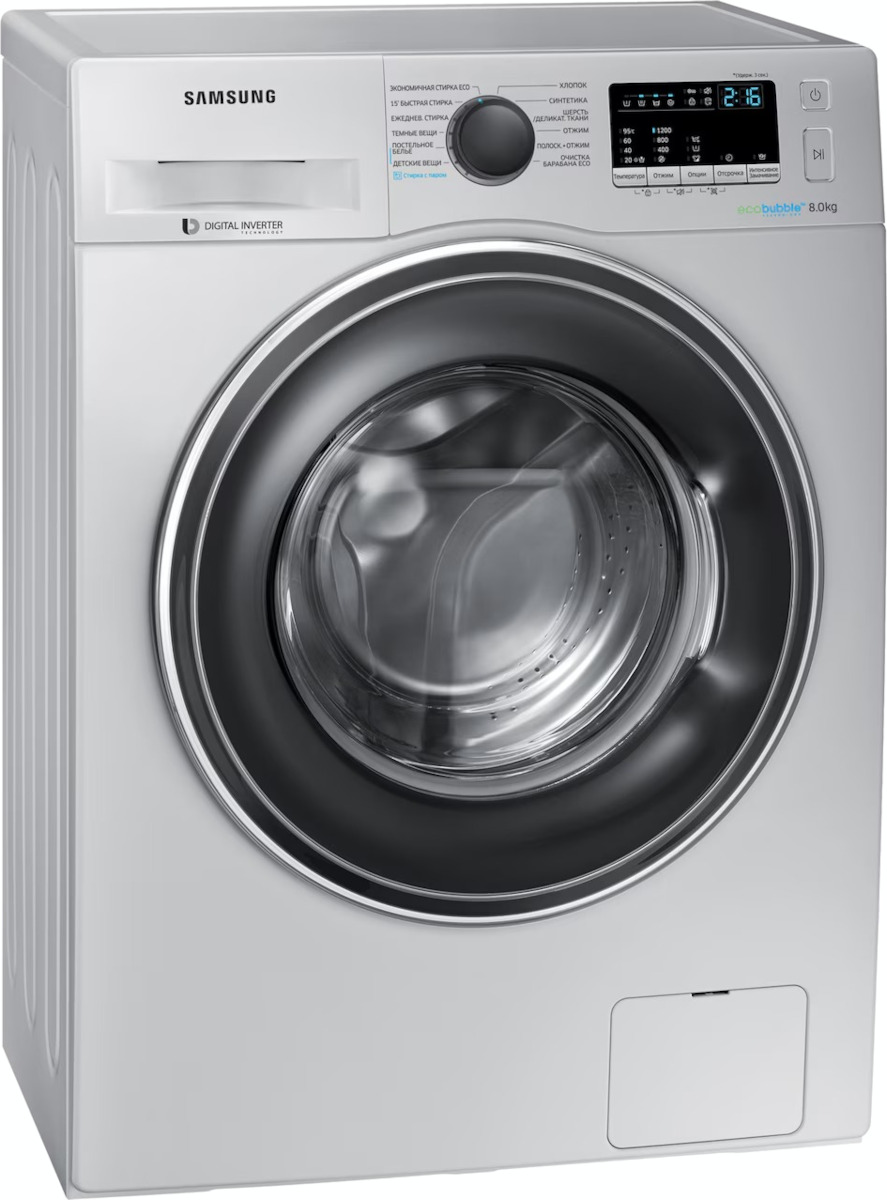Цвет этой стиральной машинки — серебристый. В данной модели Samsung используется барабан Swirl. Мотор: Инверторный. Благодаря ему машина работает тише, потребляет меньше электроэнергии, сохраняя при этом необходимую мощность.