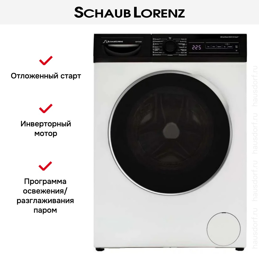 Цвет этой стиральной машинки — белый. В данной модели Schaub Lorenz используется барабан сотовый. Мотор: Инверторный. Благодаря ему машина работает тише, потребляет меньше электроэнергии, сохраняя при этом необходимую мощность.