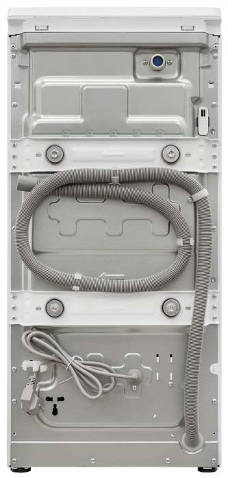 Модели с вертикальной загрузкой отличает надежное крепление барабана на двух валах. Еще одно их отличие — особая конструкция люка: на нем имеется отверстие, закрывающееся на замок. Чтобы получить доступ к барабану, необходимо открыт его и отодвинуть створку.