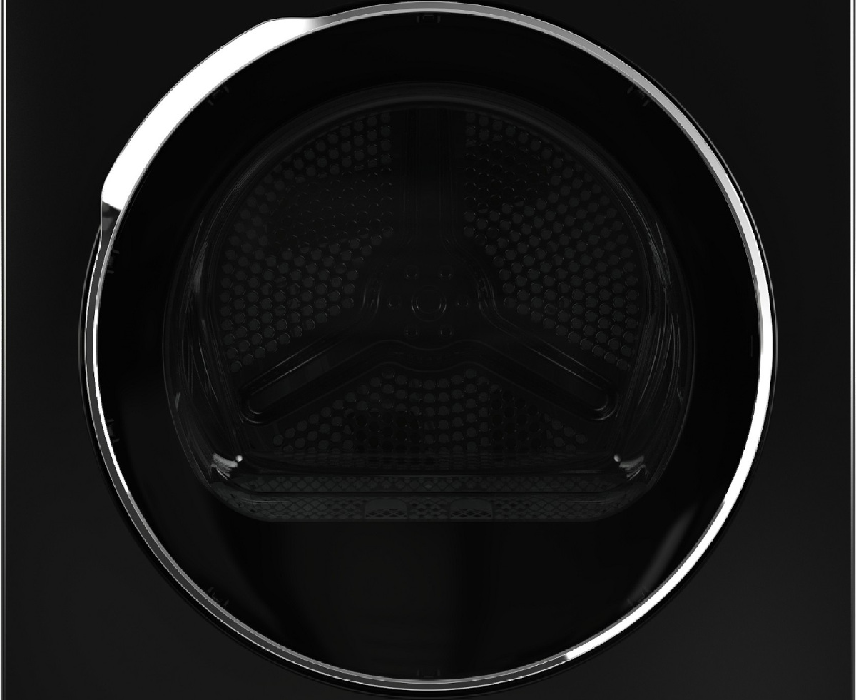 В барабан единовременно можно загрузить 10 кг. Его реверсивное вращение предотвращает сбивание вещей в ком и образование дисбаланса. Подсветка — не только красивая, но и функциональная деталь, так как дает хороший обзор, как проходит сушка. Цвет корпуса — черный. Конструктивные решения, которые выделяют эту модель: регулируемые ножки.