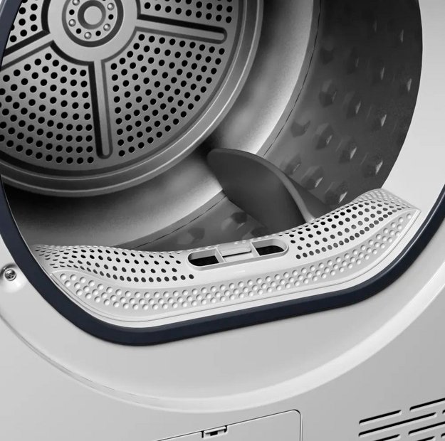 Тип сушки белья в данной модели — тепловой насос. Благодаря этому воздух поступает в барабан уже теплым, что ускоряет работу.