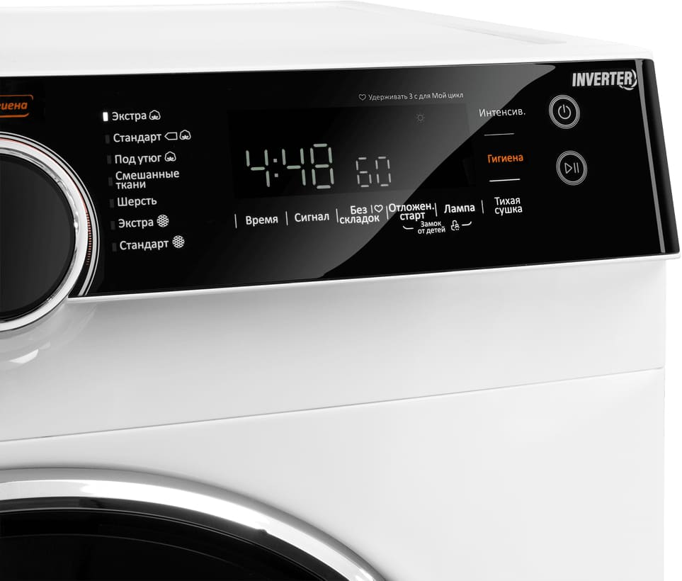 Вы можете самостоятельно выбрать время, которое будет длиться программа, но нужно тщательно рассчитать его — обычно проще воспользоваться предложенными вариантами. Используйте также параметры остаточной влажности, в данной модели есть следующие: под утюг, сухое, экстрасушка — они позволяют точно определить, каким вы достанете белье из барабана.