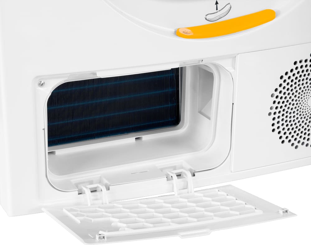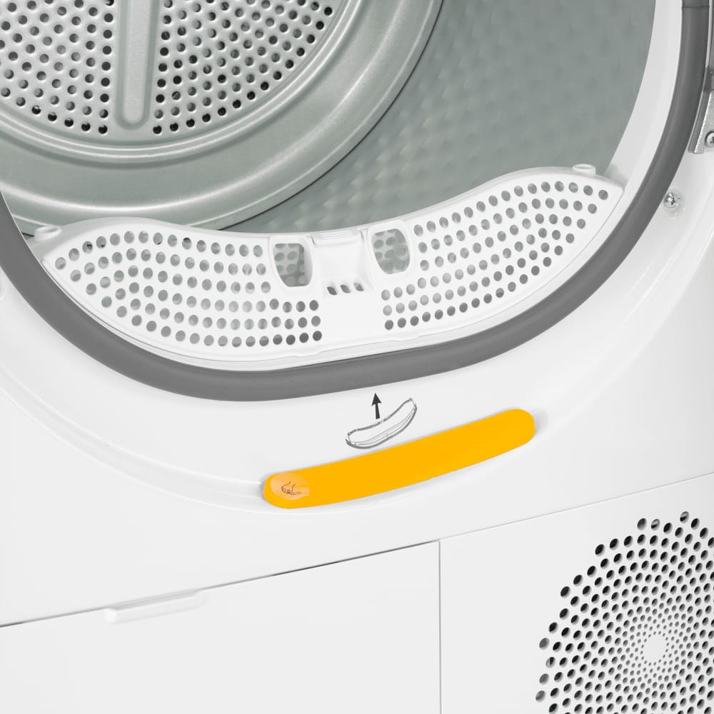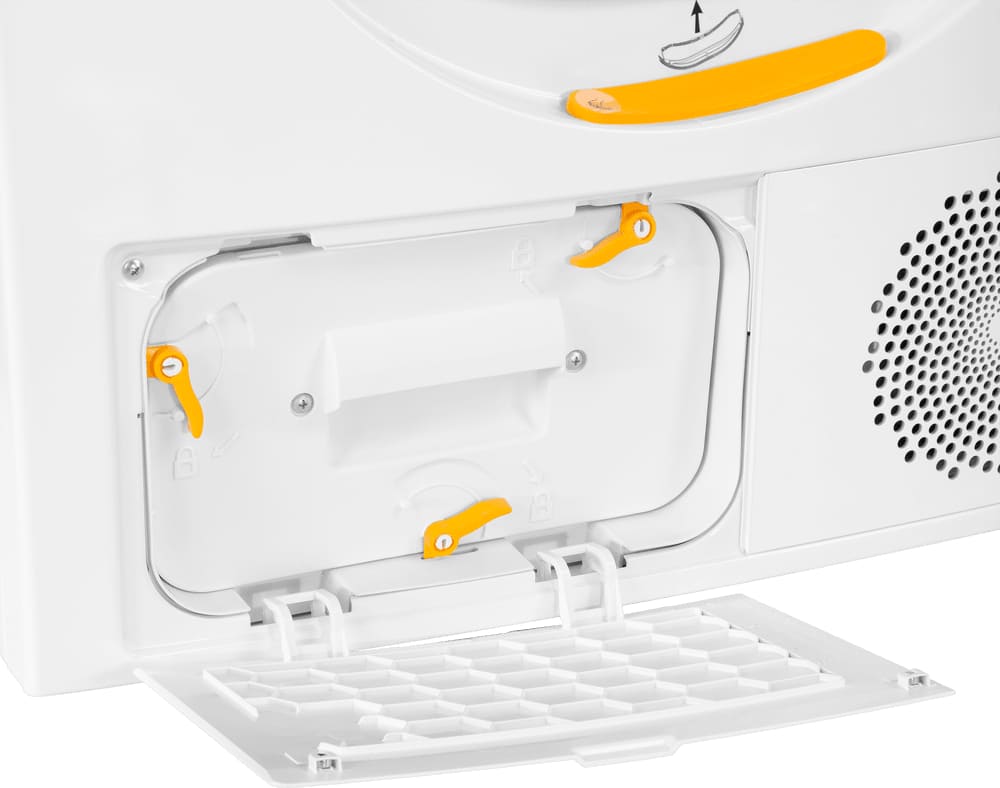 Сушильные машины конденсационного типа, как и устройства с тепловым насосом, не требуют присоединения к системе вентиляции и подключаются только к электросети. Конденсат, который удаляется из загруженного белья, стекает в специальный контейнер. Он расположен так, чтобы его извлечение было максимально удобным — например, в верхней части корпуса, там, где у стиральных машин находится лоток для порошка. Опустошать этот контейнер необходимо вручную — как правило, после завершения каждого цикла работы. О необходимости слива конденсата предупреждает специальный индикатор на панели управления.