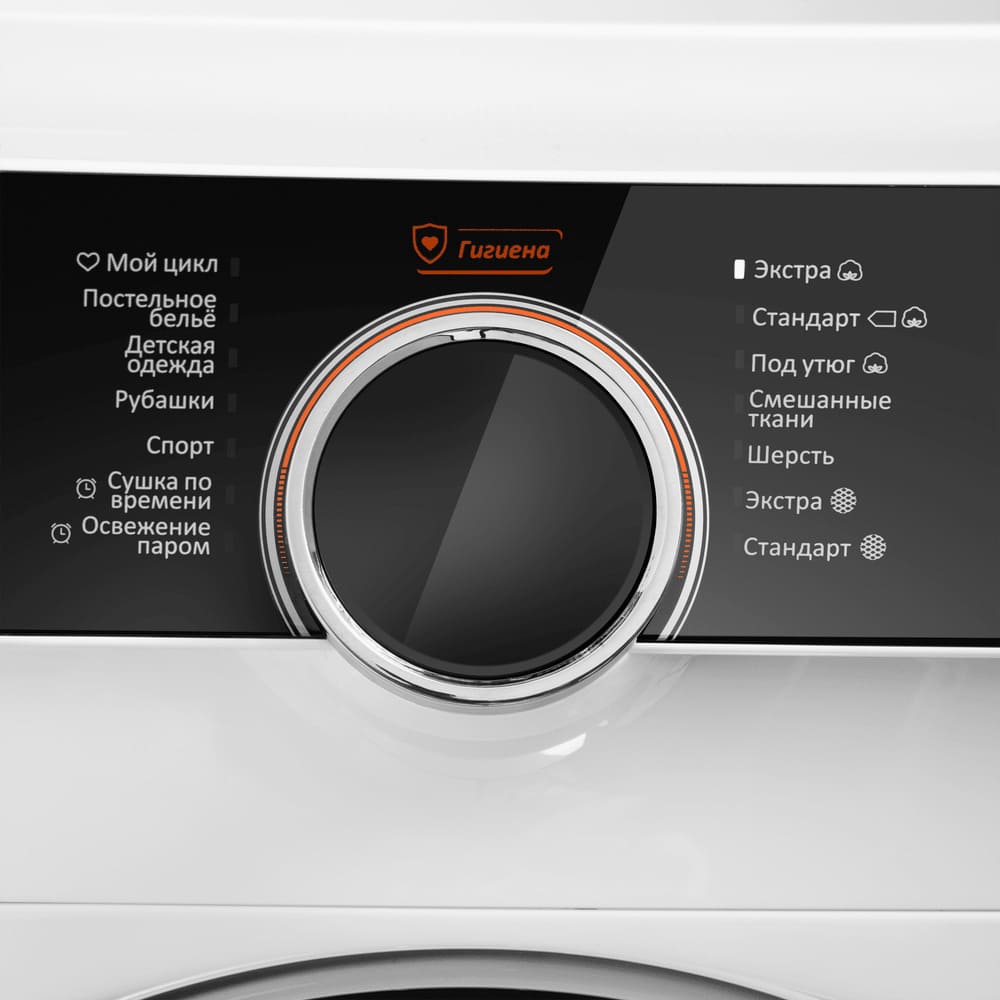 Элементы на панели управления сушильной машины служат для выбора программы сушки, для регулировки параметров работы, для задания дополнительных опций. Большинство сушильных маши оборудовано поворотными переключателями: с их помощью можно легко выбирать программу сушки — по остаточной влажности, по типу ткани, по виду изделий, по времени. Кнопки предназначаются для добавления к программе дополнительных опций: они могут быть как обычными, так сенсорными — в последнем случае все варианты выбора отображаются на дисплее, и возможности управления становятся более удобными и гибкими.