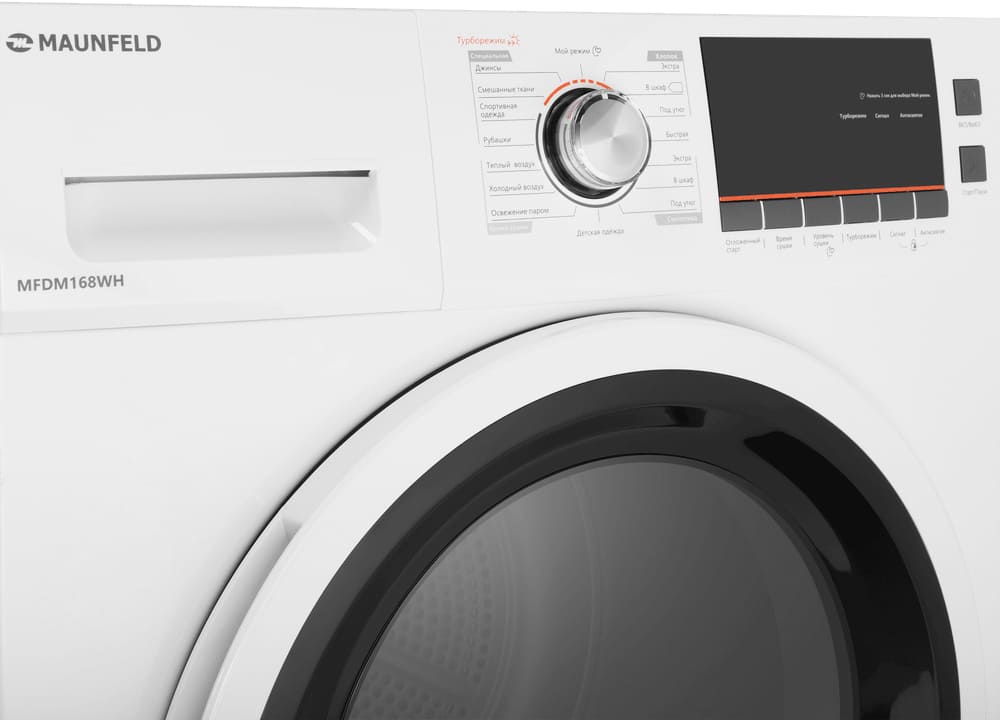 Сушильная машина Maunfeld предназначена для домашнего использования, поэтому имеет стандартные габариты и большое разнообразие программ. Так как она устанавливается отдельно, нужно заранее найти достаточно места в помещении. Особенности, на которые нужно обратить внимание при размещении: возможность установки в колонну. Колонна — это название для совместной установки со стиральной машиной друг на друга, обычно для этого нужен специальный крепежный элемент.