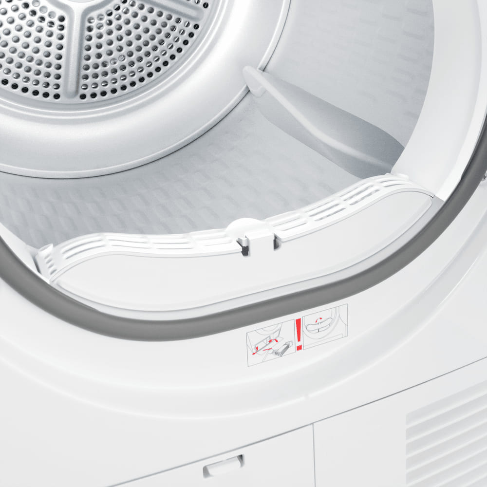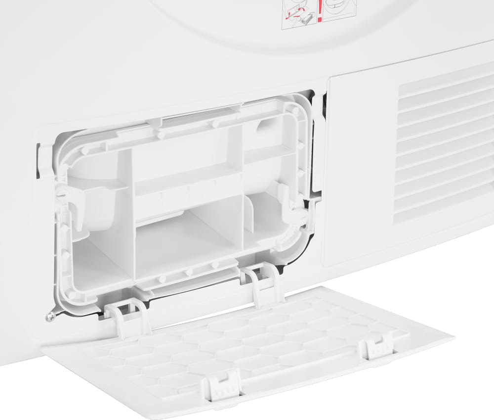 Сушильные машины конденсационного типа, как и устройства с тепловым насосом, не требуют присоединения к системе вентиляции и подключаются только к электросети. Конденсат, который удаляется из загруженного белья, стекает в специальный контейнер. Он расположен так, чтобы его извлечение было максимально удобным — например, в верхней части корпуса, там, где у стиральных машин находится лоток для порошка. Опустошать этот контейнер необходимо вручную — как правило, после завершения каждого цикла работы. О необходимости слива конденсата предупреждает специальный индикатор на панели управления.