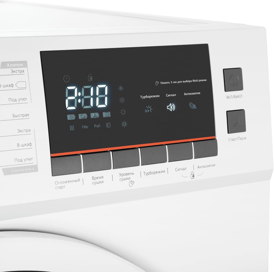 Электронное управление удобно и понятно для людей разного поколения. Контролировать процесс можно с помощью дисплея, на который выводится основная информация. В вашем распоряжении индикаторы: хода программы/этапа сушки/времени выполнения цикла, времени до окончания программы, продолжительности отсрочки пуска, заполнения емкости для конденсата/необходимости опорожнения резервуара, заполнения ворсового фильтра/необходимости смены фильтра, активной функции защиты от детей/блокировки панели управления. Вы можете использовать таймер, чтобы отложить запуск на подходящее время. Когда машинка прекратит работу, вы услышите специальный сигнал. Другие полезные опции, которые помогут вам: сенсор влажности.