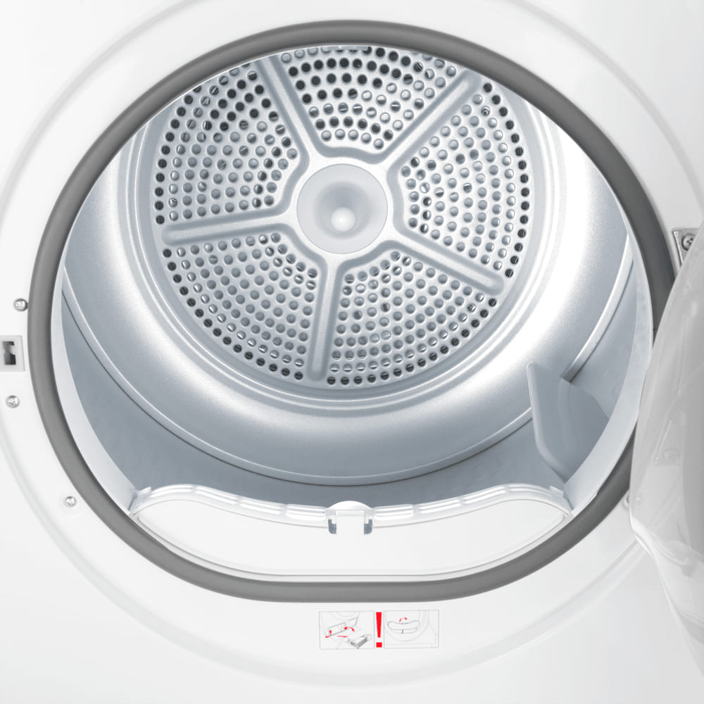 - Тепловой насос — поступающий внутрь воздух нагревается, что ускоряет и улучшает эффективность сушки. Затем он проходит через конденсационный отдел, отдает влагу и сухим повторно возвращается в барабан.