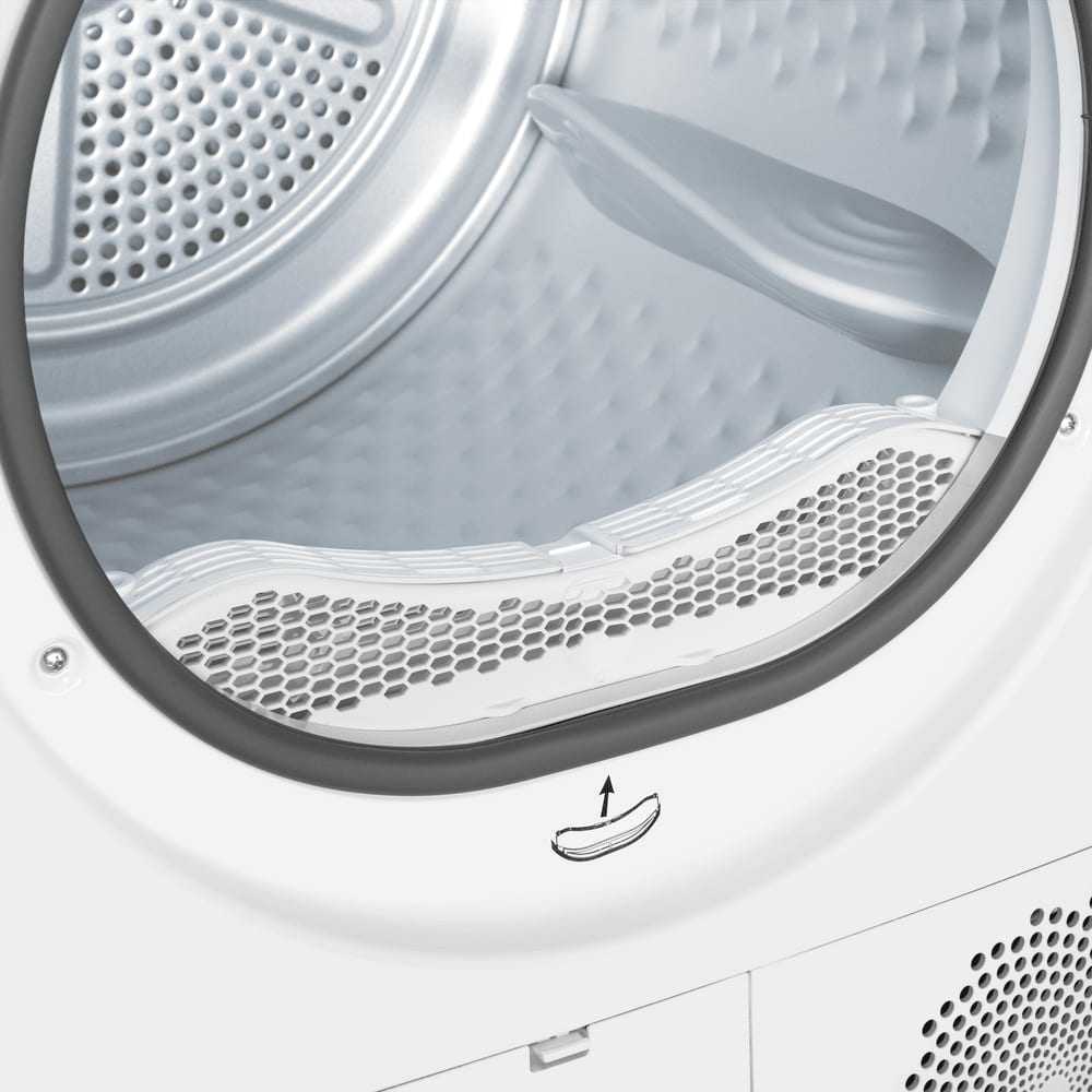 Стенки барабана покрыты «сотами» — небольшими выемками, благодаря которым образуется воздушная прослойка. Она амортизирует белье, увеличивает скорость сушки, предохраняет от складок.