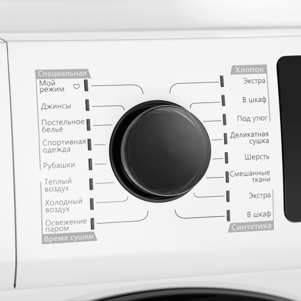 Элементы на панели управления сушильной машины служат для выбора программы сушки, для регулировки параметров работы, для задания дополнительных опций. Большинство сушильных маши оборудовано поворотными переключателями: с их помощью можно легко выбирать программу сушки — по остаточной влажности, по типу ткани, по виду изделий, по времени. Кнопки предназначаются для добавления к программе дополнительных опций: они могут быть как обычными, так сенсорными — в последнем случае все варианты выбора отображаются на дисплее, и возможности управления становятся более удобными и гибкими.
