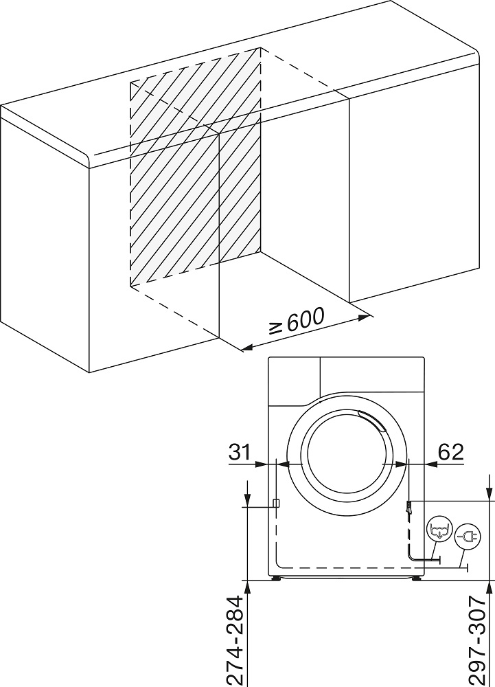 Если вы собираете комплект из совместимых стиральной и сушильной машин, вы можете установить их рядом стык в стык, чтобы удобно было перекладывать белье в сушку после стирки.