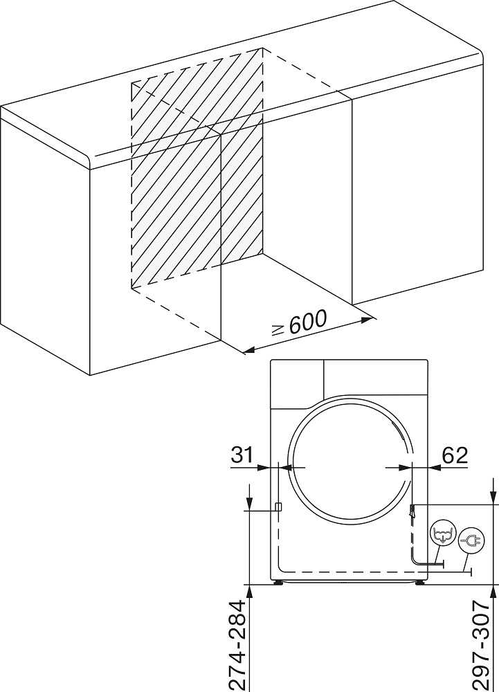 Если вы собираете комплект из совместимых стиральной и сушильной машин, вы можете установить их рядом стык в стык, чтобы удобно было перекладывать белье в сушку после стирки.