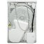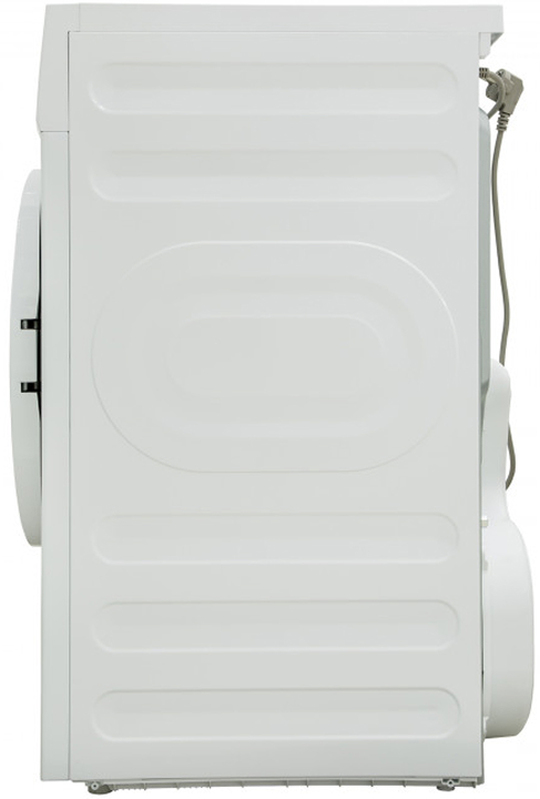 В барабан единовременно можно загрузить 8 кг. Его реверсивное вращение предотвращает сбивание вещей в ком и образование дисбаланса. Подсветка — не только красивая, но и функциональная деталь, так как дает хороший обзор, как проходит сушка. Цвет корпуса — белый.