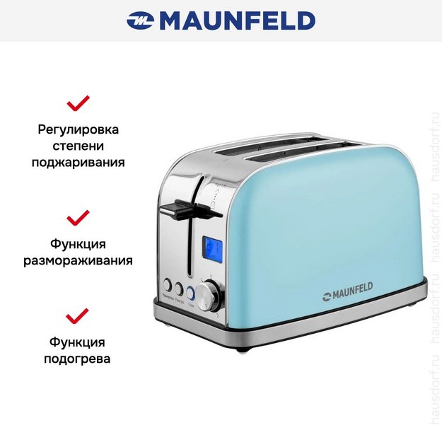 Стильный тостер Maunfeld имеет компактный корпус на устойчивых ножках, благодаря которым не пошатывается, даже если хлеб выпрыгивает вверх в конце приготовления. Основной материал, из которого изготовлен прибор, — нержавеющая сталь. Его главный оттенок — голубой. Простое и понятное механическое управление позволяет быстро разобраться во всех функциях. Простое и понятное электронное управление позволяет быстро разобраться во всех функциях. На корпусе расположены кнопочные+поворотные переключатели для изменения настроек. Благодаря небольшому дисплею еще удобнее следить за процессом.