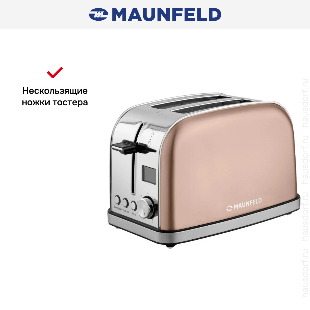Стильный тостер Maunfeld имеет компактный корпус на устойчивых ножках, благодаря которым не пошатывается, даже если хлеб выпрыгивает вверх в конце приготовления. Основной материал, из которого изготовлен прибор, — нержавеющая сталь. Его главный оттенок — бронза. Простое и понятное механическое управление позволяет быстро разобраться во всех функциях. Простое и понятное электронное управление позволяет быстро разобраться во всех функциях. На корпусе расположены кнопочные+поворотные переключатели для изменения настроек. Благодаря небольшому дисплею еще удобнее следить за процессом.