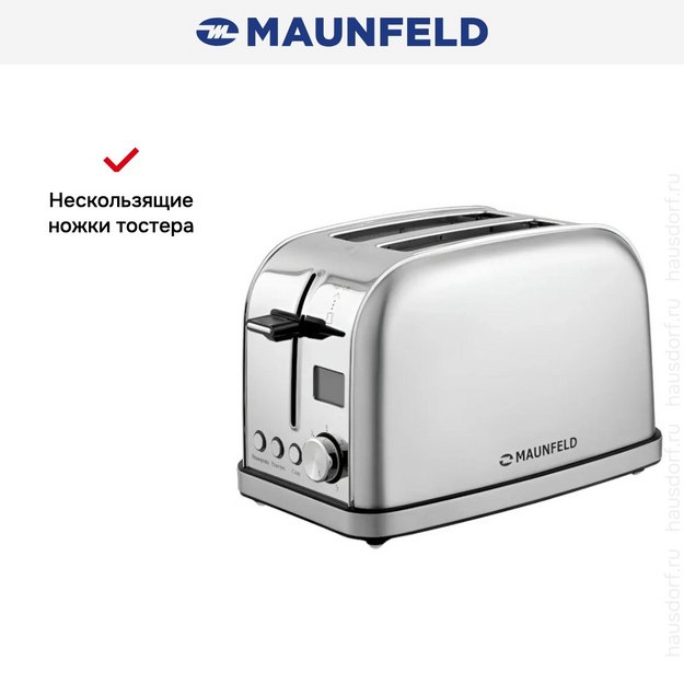 Стильный тостер Maunfeld имеет компактный корпус на устойчивых ножках, благодаря которым не пошатывается, даже если хлеб выпрыгивает вверх в конце приготовления. Основной материал, из которого изготовлен прибор, — нержавеющая сталь. Его главный оттенок — нержавеющая сталь. Простое и понятное механическое управление позволяет быстро разобраться во всех функциях. Простое и понятное электронное управление позволяет быстро разобраться во всех функциях. На корпусе расположены кнопочные+поворотные переключатели для изменения настроек. Благодаря небольшому дисплею еще удобнее следить за процессом.