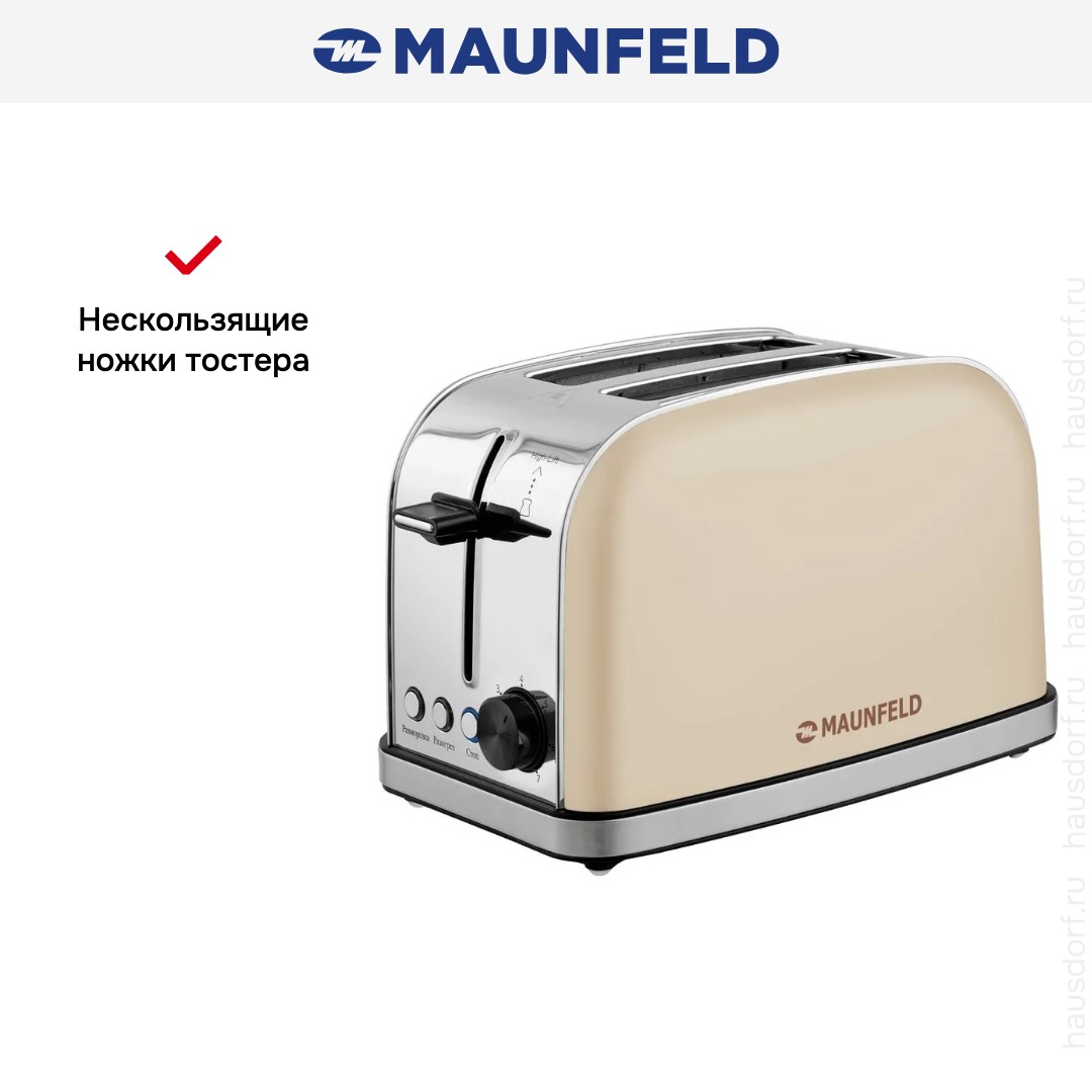 Стильный тостер Maunfeld имеет компактный корпус на устойчивых ножках, благодаря которым не пошатывается, даже если хлеб выпрыгивает вверх в конце приготовления. Основной материал, из которого изготовлен прибор, — нержавеющая сталь. Его главный оттенок — бежевый. Простое и понятное механическое управление позволяет быстро разобраться во всех функциях. Простое и понятное электронное управление позволяет быстро разобраться во всех функциях. На корпусе расположены кнопочные+поворотные переключатели для изменения настроек.