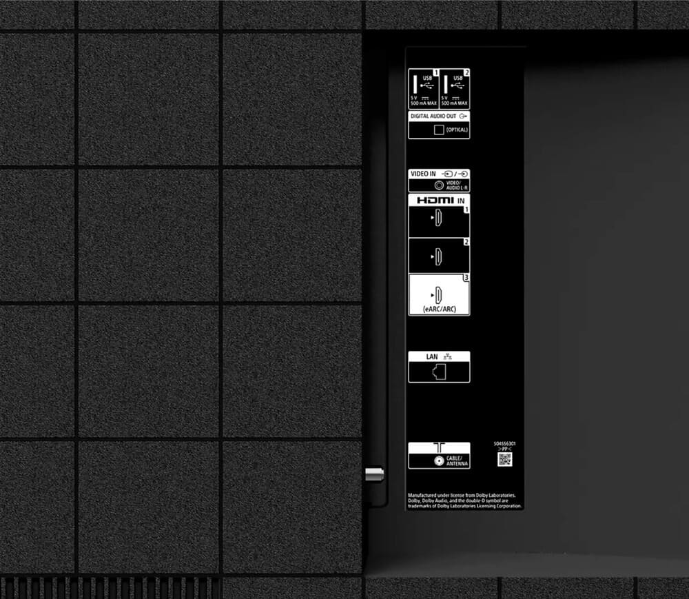 Выглядит как широкая панель черного цвета с тонкой рамкой и низкопрофильной глубиной 9.4 см, занимая внушительное пространство шириной 165 см. В комплекте предусмотрена подставка, увеличивающая высоту до 102.8 см, или возможна настенная установка по стандарту VESA 400×400. Масса без опоры — 25 кг, с подставкой — 26 кг, что облегчает монтаж и перестановку.