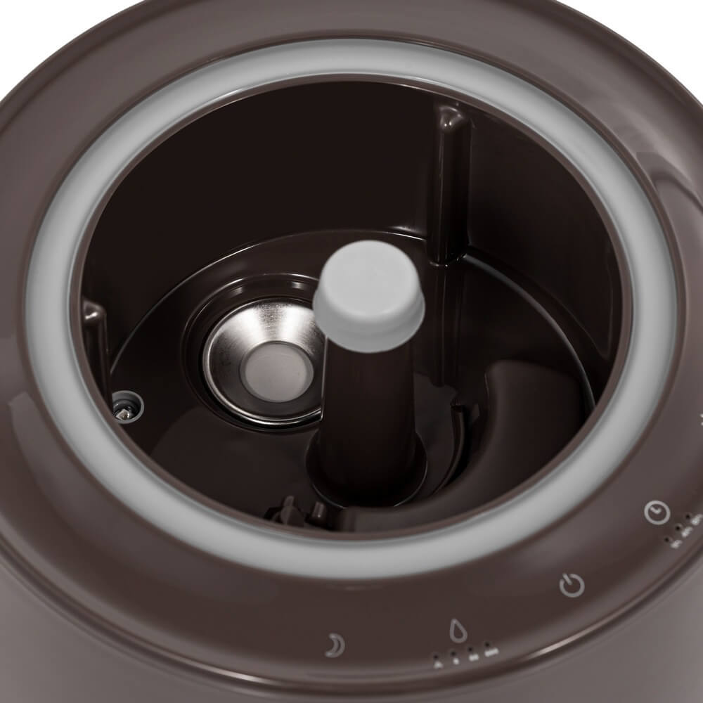 Компактные габариты — высота 470 мм при глубине и ширине по 210 мм — позволяют разместить увлажнитель на тумбе, подоконнике, журнальном столике или в детской комнате, не занимая много места. Элегантный коричневый оттенок корпуса придаёт изделию утончённый, теплый вид, гармонично дополняя интерьеры в стиле лофт, скандинавский или эко.
