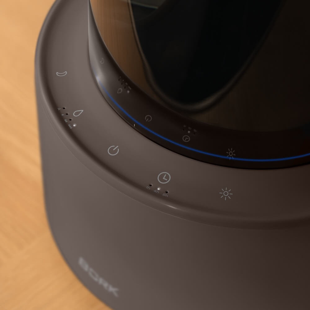 Электронное управление работой увлажнителя воздуха Bork позволяет регулировать параметры одним нажатием кнопки, а информативный дисплей демонстрирует текущие характеристики работы. Отсутствие выступающих регуляторов на корпусе создает лаконичный дизайн.