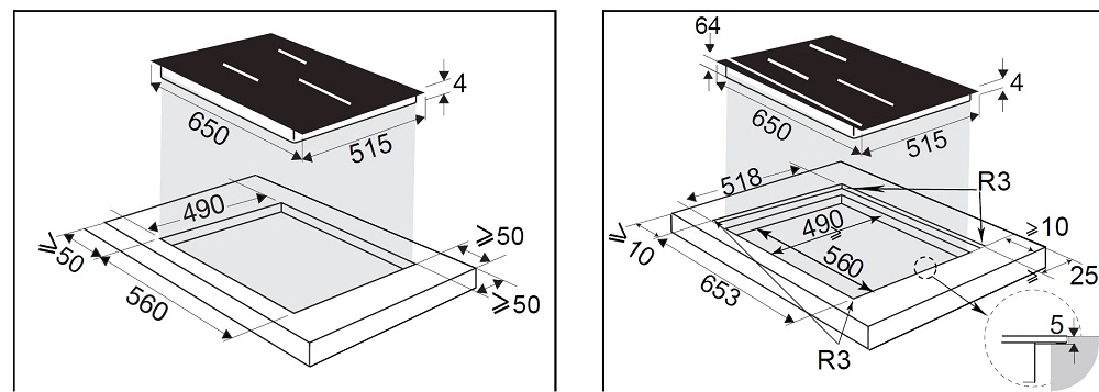 Электрические и индукционные варочные панели из стали, эмали и стеклокерамики имеют толщину от 4 до 5,5 cм, но выглядят более низкими, так как на них отсутствуют выступающие горелки. Как правило, подробные требования к толщине столешницы для установки приводятся в руководстве пользователя.