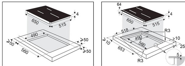 Отверстие в нише выполняют, исходя из размеров самой варочной панели — они должны соответствовать друг другу либо немного превышать размеры выреза. При выборе наиболее распространенной варочной панели с 4 конфорками в столешнице вырезается отверстие шириной 59 см и глубиной около 49-50 см. Толщина столешницы должна быть немного меньше, чем высота варочной панели, в противном случае панель придется заглубить, чтобы она не слишком выступала.