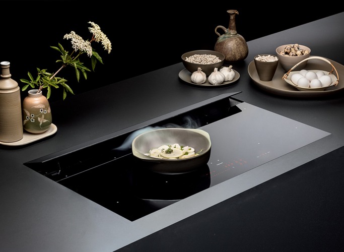 Вытяжка, встроенная в варочную панель — достаточно удобный вариант, позволяющий сэкономить место в кухне. Такая конструкция позволяет лучше улавливать испарения, не давая им распространяться по всему помещению, и способствует более качественной очистке воздуха. Большинство подобных моделей может работать только в режиме рециркуляции воздуха, с удалением капель жира, сажи, неприятных запахов при помощи системы фильтров. Работу в режиме отвода загрязненного воздуха через систему вентиляции организовать довольно сложно, поскольку вытяжка располагается низко над полом. Часто варочная панель находится на кухонном острове, что также мешает присоединению к вентиляции. Еще одна особенность подобных моделей состоит в том, что под варочной панелью нельзя разместить духовку или другую технику, так как место будет занято.