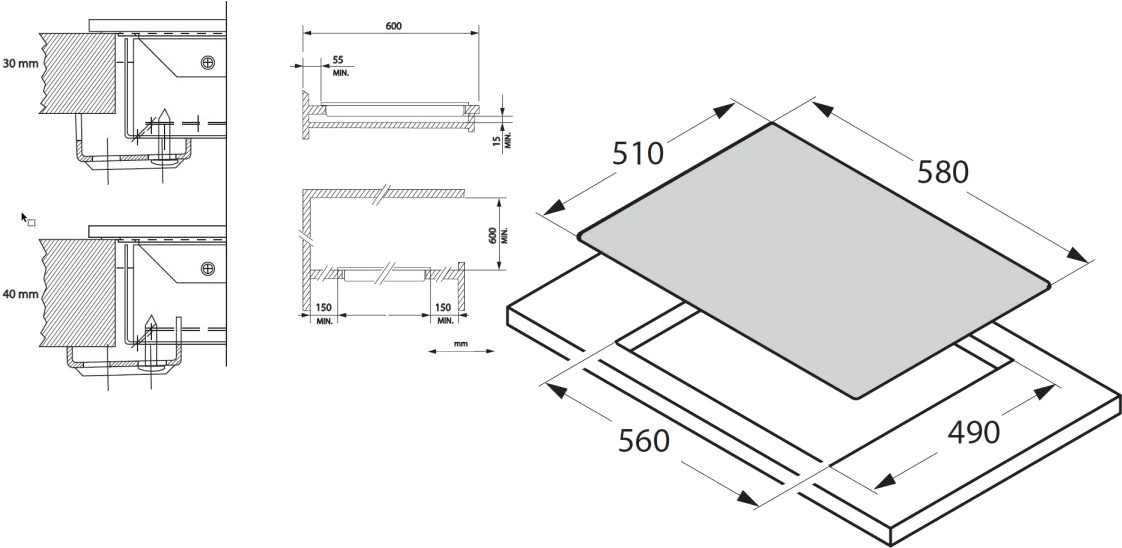 Варочные панели встраиваются в столешницу: они могут располагаться как заподлицо, так и выступать над ее поверхностью. Особенности их расположения зависят от высоты (толщины) варочной панели, а та определяется, как правило, видом нагрева, материалом поверхности и типом подключения — зависимым или независимым.