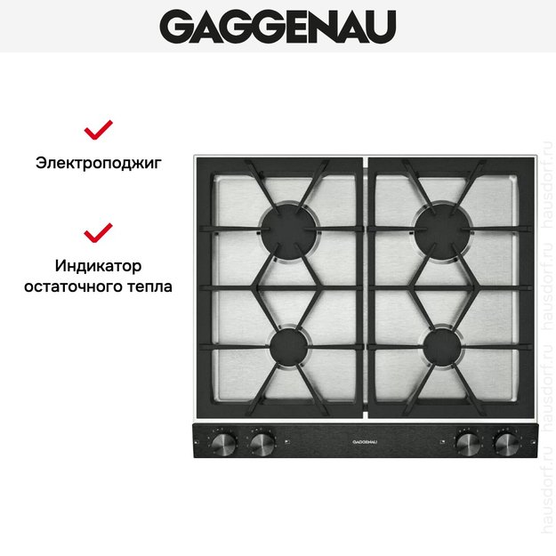 Варочная панель Gaggenau VG 264-220 оснащена чугунными держателями для посуды. Этот материал отличается высокой прочностью и способен выдерживать высокие температуры. Благодаря термоэлектрической защите от утечки газа обеспечивается безопасность эксплуатации.