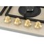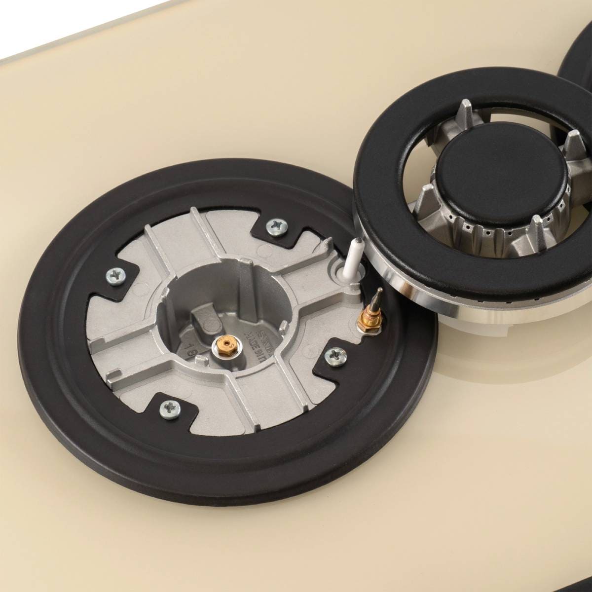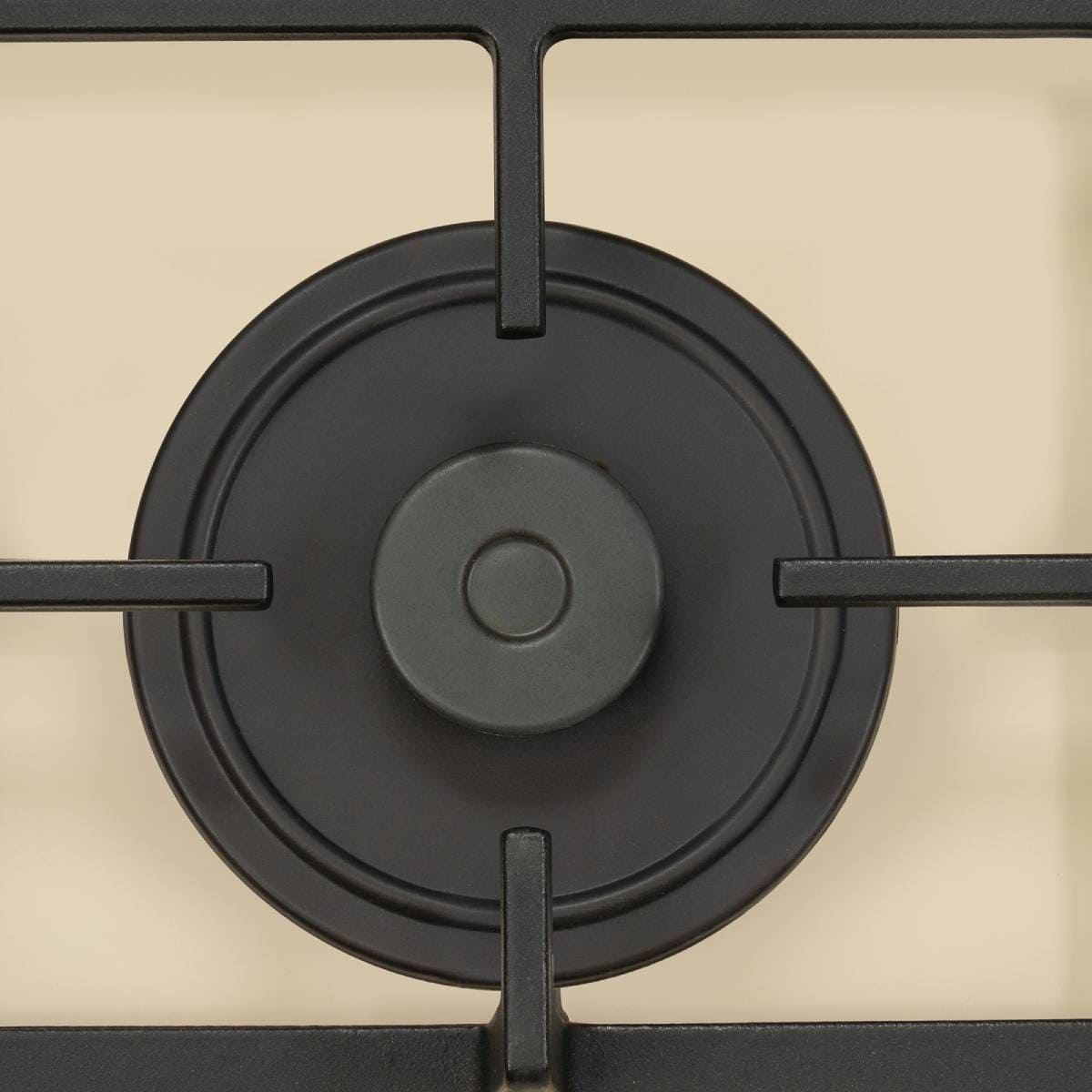 Цвет — бежевый. Благодаря отсутствию рамки она отлично впишется в интерьер и не займет лишнее место на столешнице, которое можно использовать для работы. Открытый огонь не страшен ни вашей посуде, ни вам, так как горелки надежно закрыты решетками. Материал самой поверхности: закаленное стекло. Управление этой моделью механическое. Для переключения уровней нагрева, выбора функций используются следующие переключатели: поворотные. Простая система контроля за прибором делают его более универсальным, ведь разобраться сможет кто угодно.