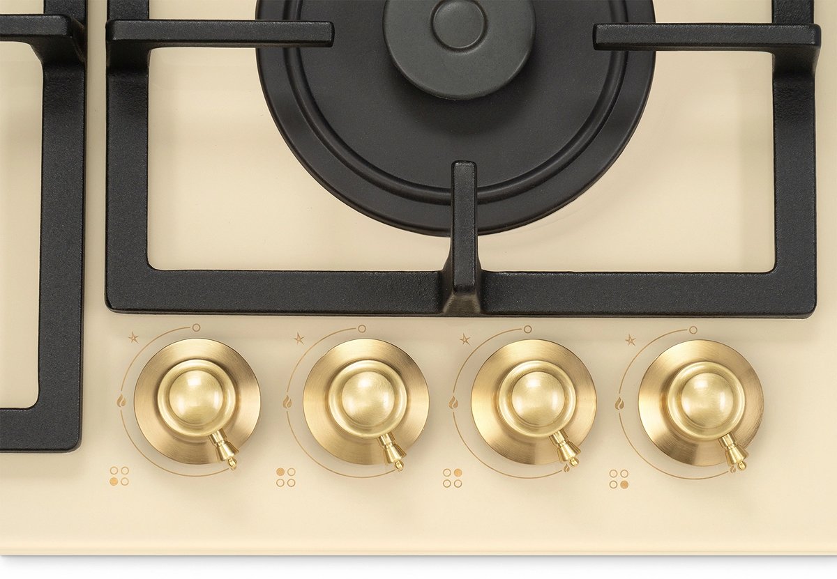 Для варочных панелей в стиле кантри, ампир или классическом характерны латунные ручки из сплава меди и цинка, которые смотрятся благородно и выигрышно. Реже производятся модели, имеющие золотистую или медную фурнитуру.