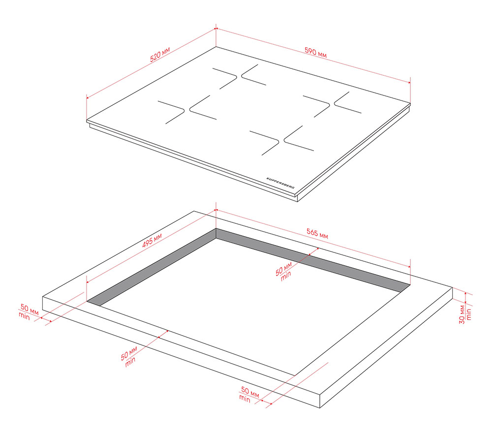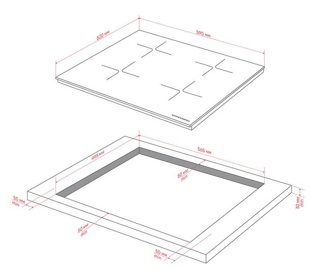 Отверстие в нише выполняют, исходя из размеров самой варочной панели — они должны соответствовать друг другу либо немного превышать размеры выреза. При выборе наиболее распространенной варочной панели с 4 конфорками в столешнице вырезается отверстие шириной 59 см и глубиной около 49-50 см. Толщина столешницы должна быть немного меньше, чем высота варочной панели, в противном случае панель придется заглубить, чтобы она не слишком выступала.