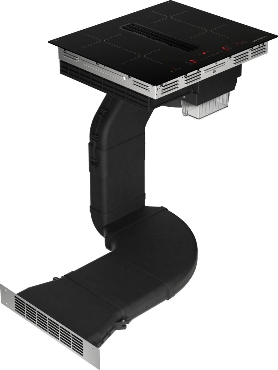 Вытяжка, встроенная в варочную панель — достаточно удобный вариант, позволяющий сэкономить место в кухне. Такая конструкция позволяет лучше улавливать испарения, не давая им распространяться по всему помещению, и способствует более качественной очистке воздуха. Большинство подобных моделей может работать только в режиме рециркуляции воздуха, с удалением капель жира, сажи, неприятных запахов при помощи системы фильтров. Работу в режиме отвода загрязненного воздуха через систему вентиляции организовать довольно сложно, поскольку вытяжка располагается низко над полом. Часто варочная панель находится на кухонном острове, что также мешает присоединению к вентиляции. Еще одна особенность подобных моделей состоит в том, что под варочной панелью нельзя разместить духовку или другую технику, так как место будет занято.