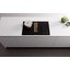 Вытяжка, встроенная в варочную панель — достаточно удобный вариант, позволяющий сэкономить место в кухне. Такая конструкция позволяет лучше улавливать испарения, не давая им распространяться по всему помещению, и способствует более качественной очистке воздуха. Большинство подобных моделей может работать только в режиме рециркуляции воздуха, с удалением капель жира, сажи, неприятных запахов при помощи системы фильтров. Работу в режиме отвода загрязненного воздуха через систему вентиляции организовать довольно сложно, поскольку вытяжка располагается низко над полом. Часто варочная панель находится на кухонном острове, что также мешает присоединению к вентиляции. Еще одна особенность подобных моделей состоит в том, что под варочной панелью нельзя разместить духовку или другую технику, так как место будет занято.