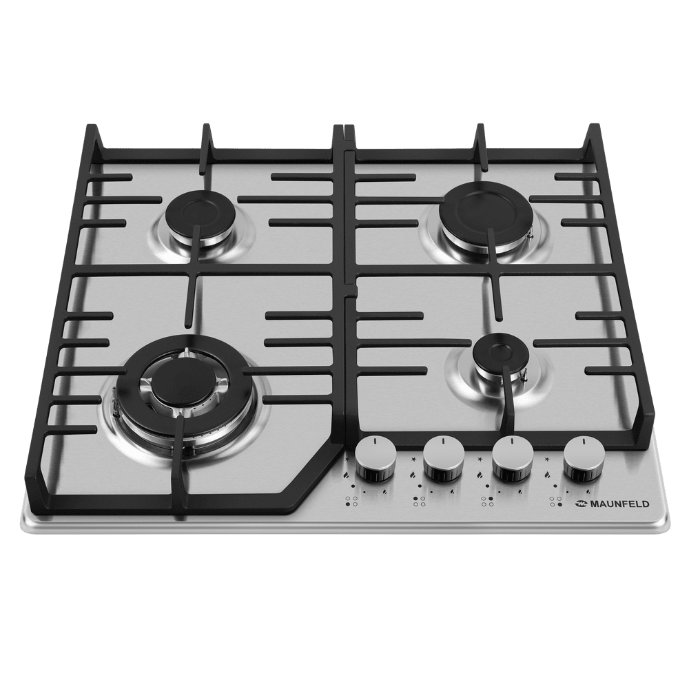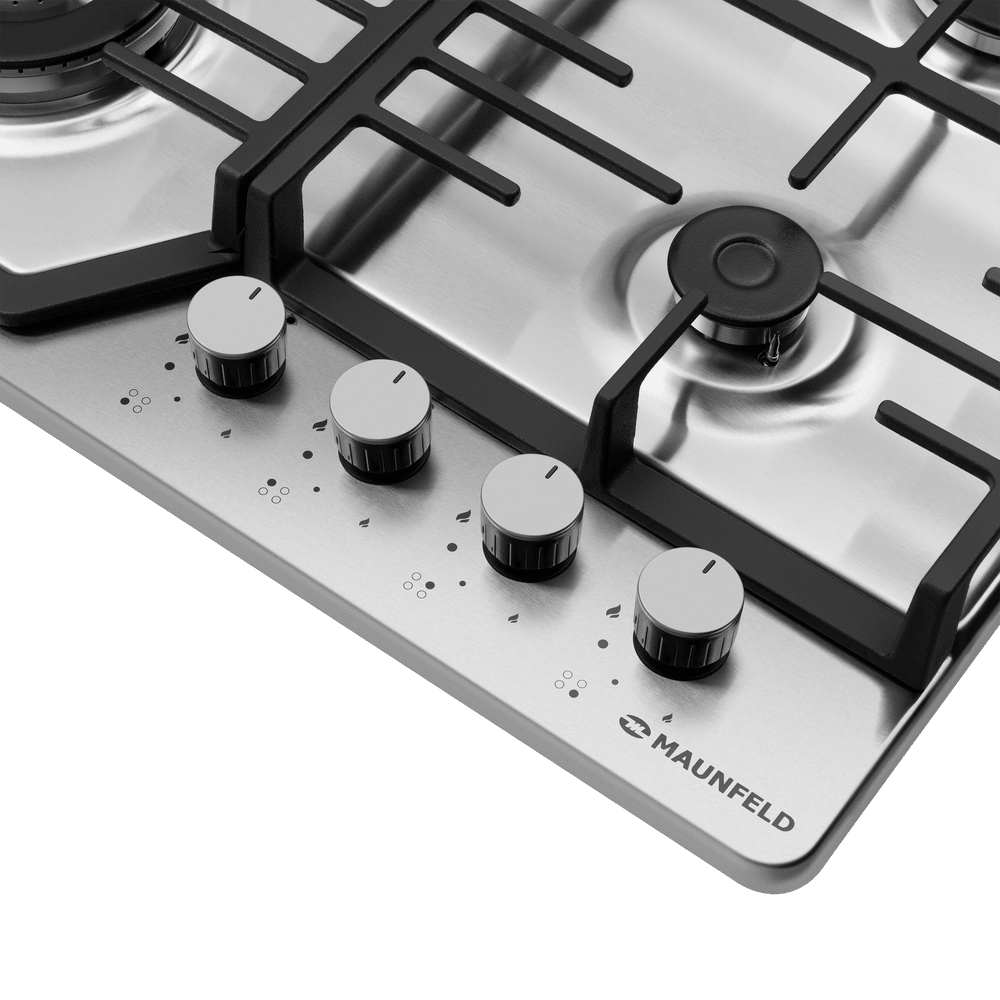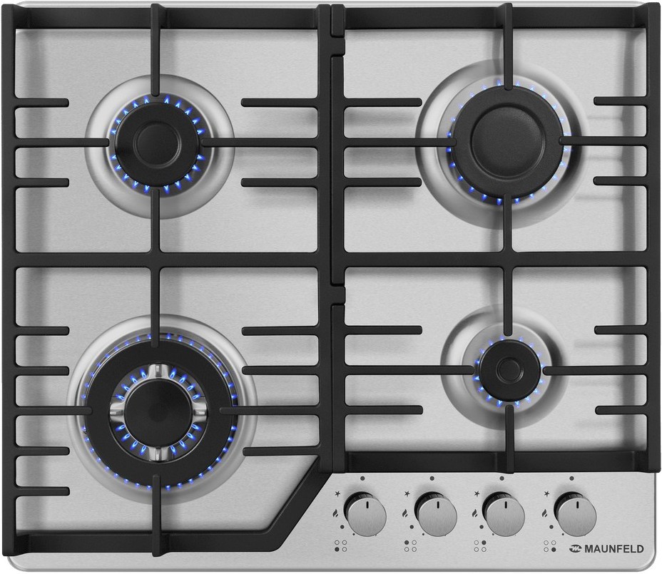 Выбор газовой варочной панели чаще всего обусловлен тем, что в частный дом или квартиру проведен именно газ в качестве обогрева. Работать с этой моделью довольно просто, так как мощность нагрева видна невооруженным взглядом — по силе огня в горелке. Количество конфорок в этой модели: 4.